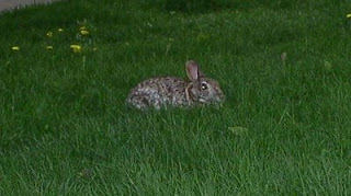 This is a better photo of one of the garden bunnies. We expect to see more of them in the weeks to come. The neighbor's cat got a baby bunny this week, and we suspect that there are more in our yard. We believe the rabbit's den is behind the compost heap next to the garage. Perhaps we have not seen the other bunny in a few days because she is caring for young ones. The garden is ready for them this this year: We have wrapped chicken wire fencing around everthing.