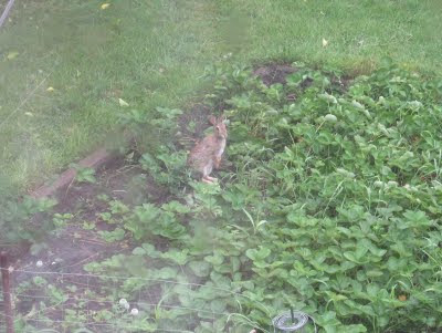 The rabbits are still around, but the vegetables are secured behind a fence. I photographed this one eating tall grass in the strawberry bed. They seem to dislike the strawberries, which are now filling in the bed after a few days of good rain.