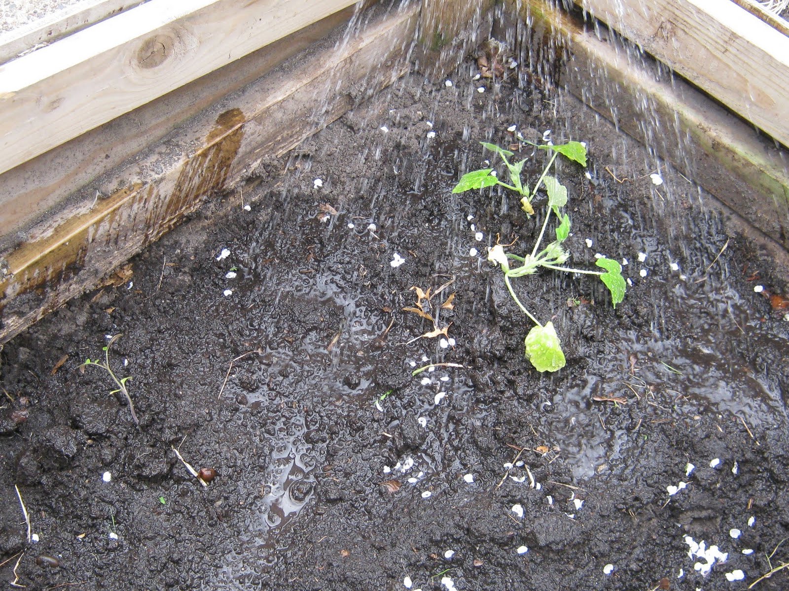 The little squash and tomato plants get a drink to set them on their way.