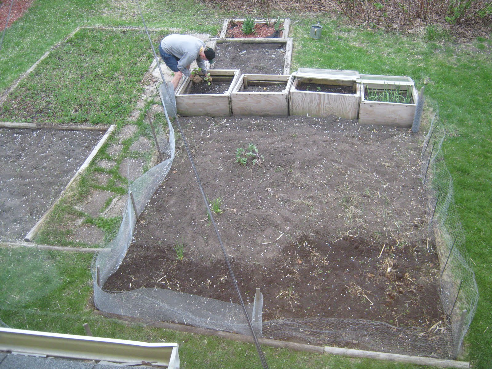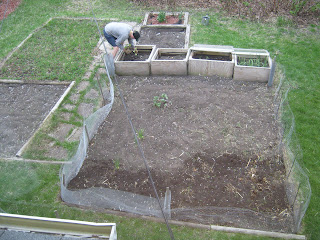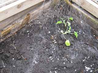 Here is David at work, planting one tomato plant and one squash plant in a cold frame. It is very early to set them in the ground, but if they stay warm in the frame, we may be eating tomatoes and squash by early July! It is worth taking a chance with just two plants.