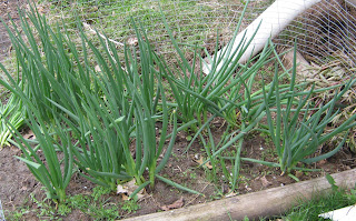 These are Egyptian onions, but so far they look like the ordinary onion variety. We will see what happens when/if they form a flower, for that is the part that makes them a curiosity in the garden.