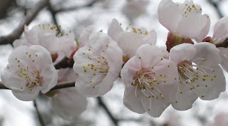 These are apricot blossoms. The four trees are covered with flowers this year, setting us up for a phenomenal harvest again this summer.