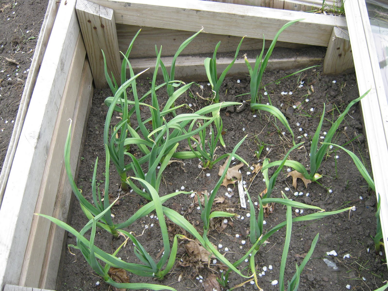 These garlic plants were planted last fall and they wintered over very well in their cold frame.