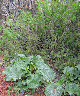 No shortage of rhubarb this spring. It has multiplied since last year. The black, red, and champagne currant bushes are full of flower buds.