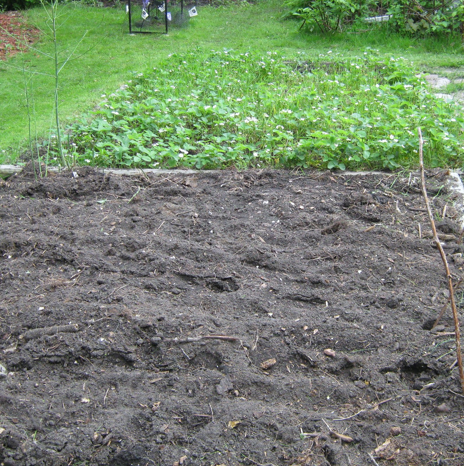 This plot is now planted with bush beans, Swiss chard, dill, and cilantro. Left some space for the sweet potatoes that should be arriving by mail in the next few days. Behind the vegetable plot, the strawberries are flowering and forming fruit. They should be ready to eat in a few weeks.