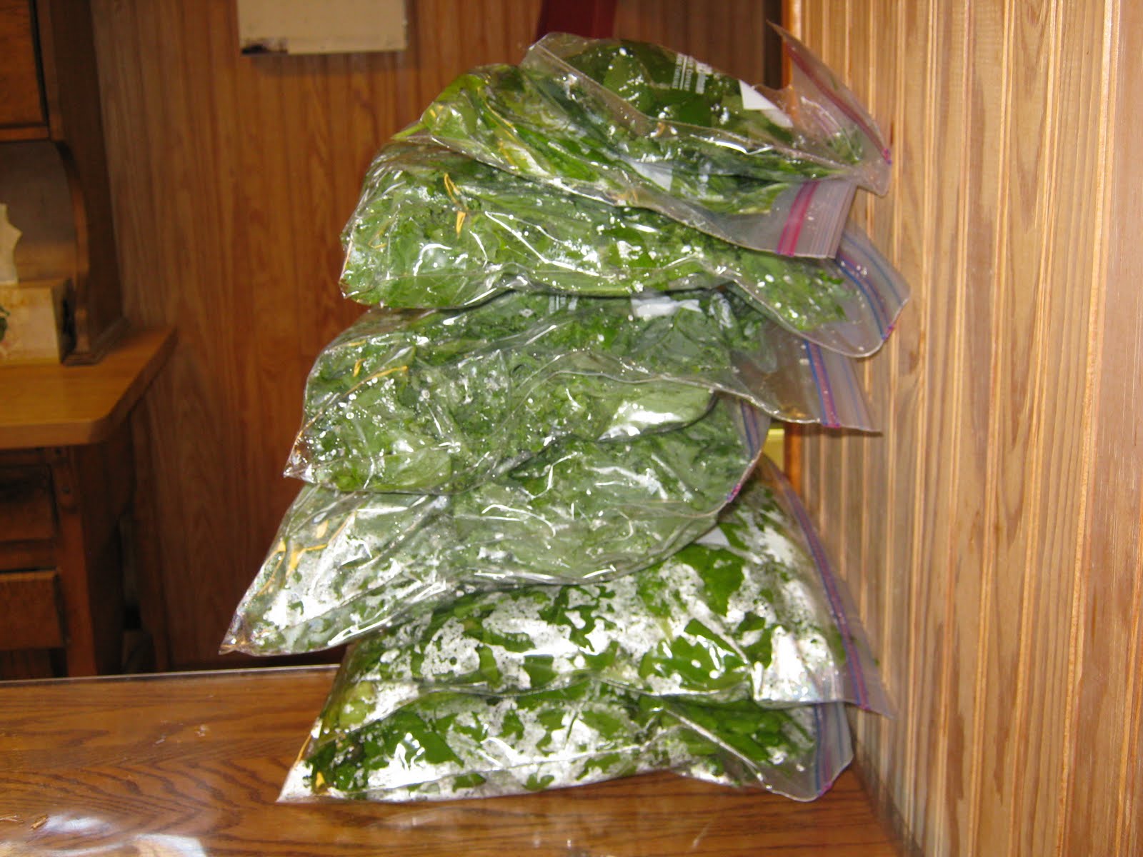 Ready for the freezer: three gallons of kale, two gallons of chard, and one quart each of basil and mint.
