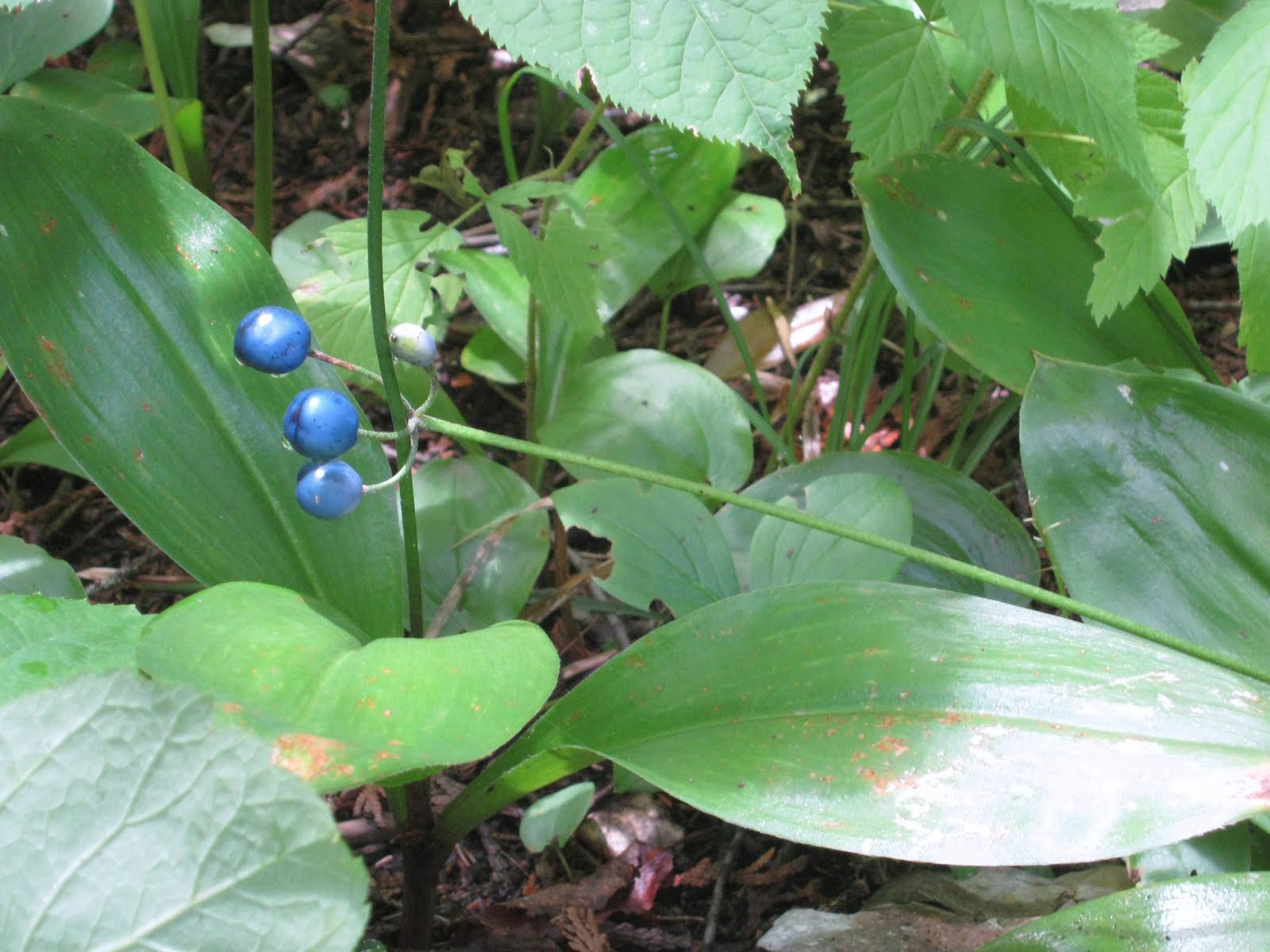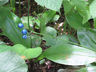 Bead Lily, a common wildflower of the forest floor, with blue berries in August.