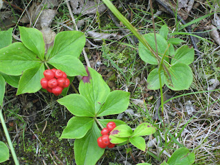 Dwarf dogwood, another wildflower of the forest floor, with red berries in August.