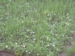 This plot is now planted with bush beans, Swiss chard, dill, and cilantro. Left some space for the sweet potatoes that should be arriving by mail in the next few days. Behind the vegetable plot, the strawberries are flowering and forming fruit. They should be ready to eat in a few weeks.
